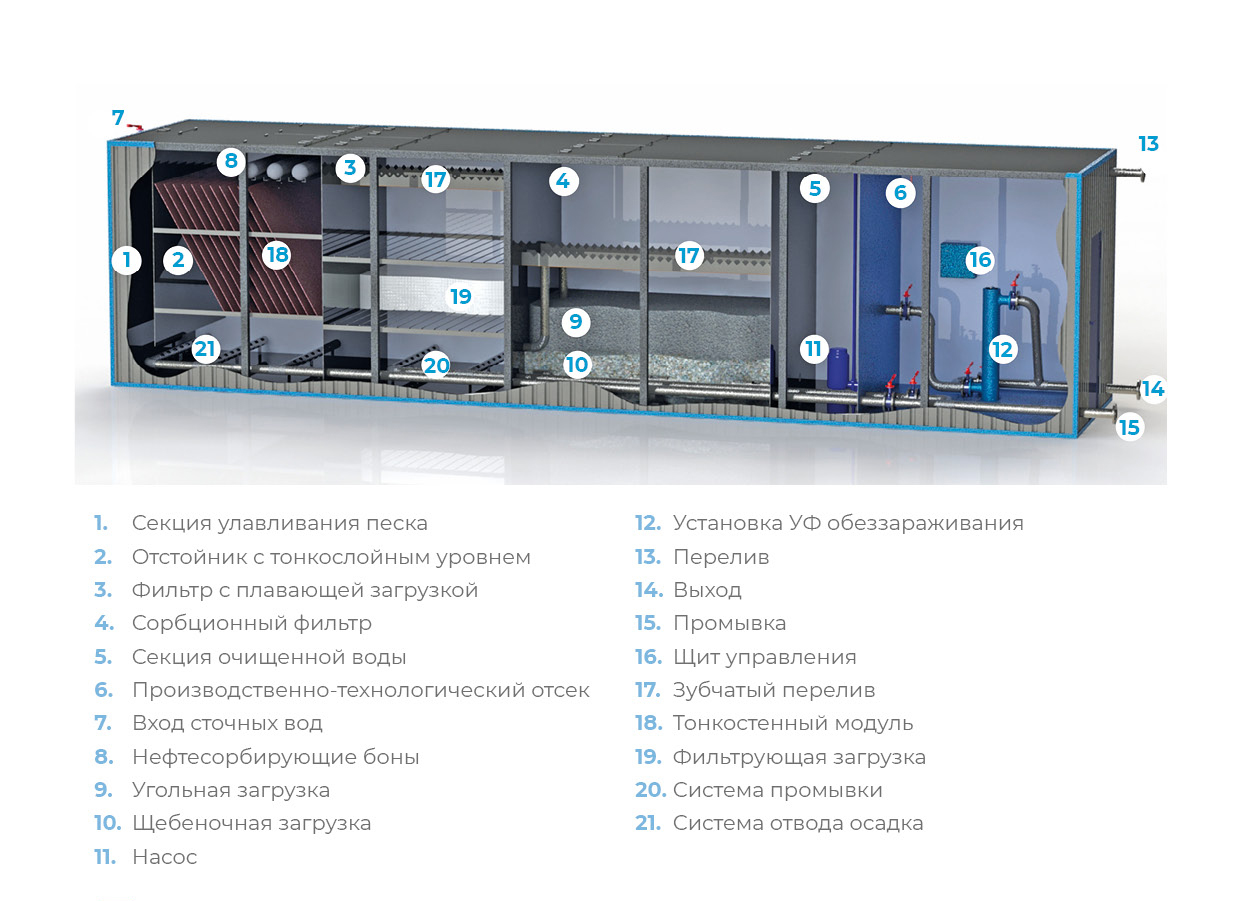 • Блок очистки представляет собой горизонтальную прямоугольную емкость, снабженную внешними патрубками подвода сточных вод, отвода очищенных сточных вод и опорожнения установки, ввода электрокабелей и кабелей автоматизации, наземного исполнения с наружным утеплением и снабженную люками для доступа и обслуживания.