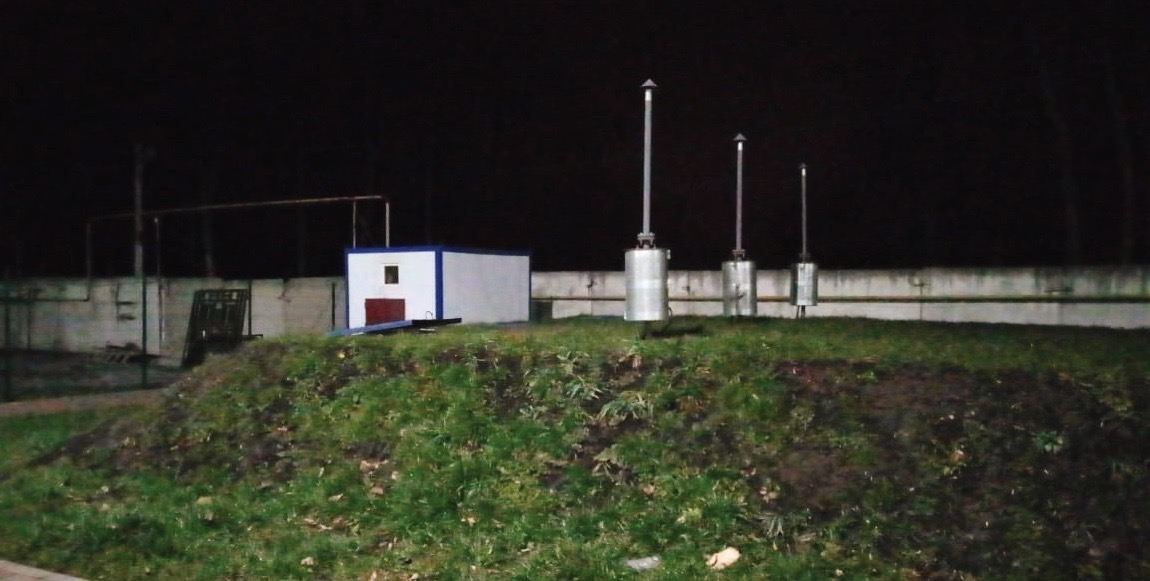 - канализационная насосная станция с 3 погружными насосами (Насосная станция выполнена в виде вертикальной емкости с нижней частью, выполняющей функции приемного резервуара, в котором расположены погружные канализационные насосы со встроенными поплавковыми выключателями. На вводе сточных вод предусмотрен решетчатый контейнер для задержания крупных включений, поднимаемый на поверхность по направляющим. В перекрытии расположен люк для доступа в приемный резервуар, оснащенный лестницей.).